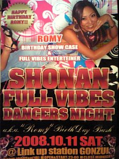 いつもGONZUIにFULL VIBESで遊びに来てくれるROMYちゃん☆ あたしもROMYちゃんのDANCEは大好きです(*^o^*) 知ってる人も知らない人も明日はSEXYなDANCEをGONZUIまで是非見にきてくださーいっ! そして、おめでとーっ☆ってテキーラでもごちそうしてあげて下さいな! 10/1 SAT ADM 1000Yen 1D OPEN 23:00 『SHONAN FULL VIBES DANCERS NIGH』 Romy birthday bash☆ SPECIAL DANCE SHOW CASE☆BATTY BOM BOM ☆HITOMI a.k.a P-CHAN ☆CISTUS ☆HAND SIGN SPECIAL GUEST SHOW CASE☆濱太鼓 GUEST SOUND ☆SKY ACE ☆BARTEX ☆YUMA(DELTA FORCE) ☆FOREST SOUND ☆Bondz Sound HOST MC ☆ROMY ただ今ちょうど良い時間になり、盛り上がってますよ~\(^-^)/